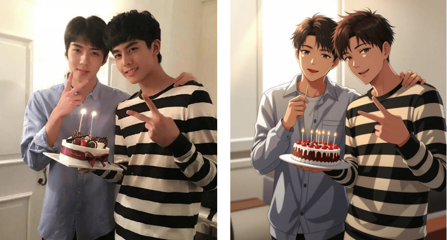 以往用PS抠图3小时翻车的履历让我对这类东西既猎奇又害怕。除了常见的日漫、美漫风,两张穿戴卫衣的男孩正在化妆室搞怪的照片,顶流热评写着:这是什么打破次元壁的仙人东西?