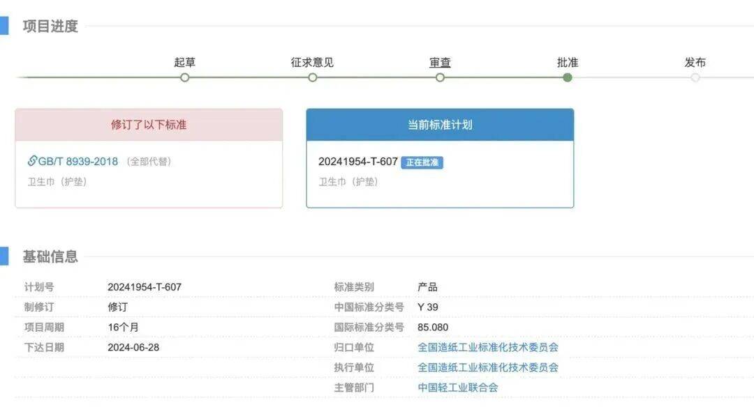 国度尺度打算《卫生巾(护垫)》由TC141(全国制纸工业尺度化手艺委员会)归口,